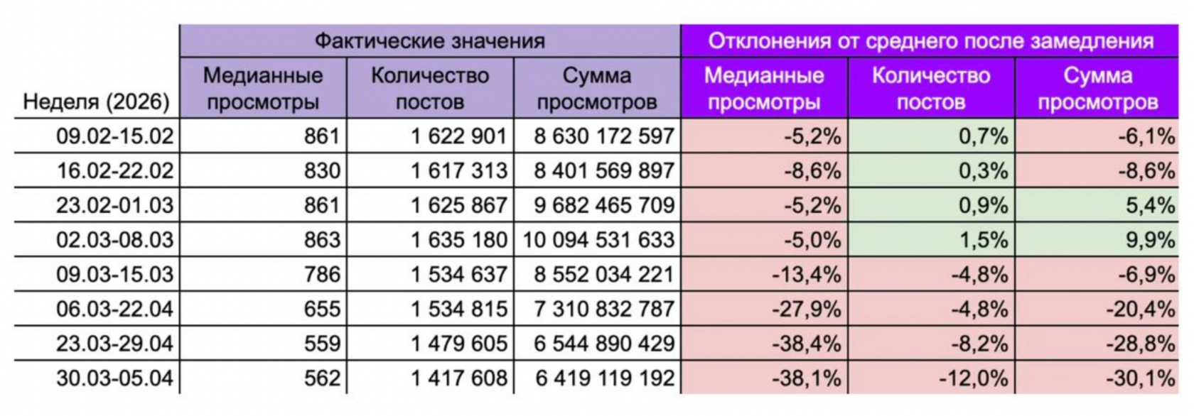 Анализ данных мониторинга 22 000 Telegram-каналов за период февраля–апреля 2026 года (исследование WIB) выявил устойчивую отрицательную динамику вовлеченности. Падение медианных просмотров на 38,1% и сокращение объема публикуемого контента на 12% свидетельствуют о том, что технические барьеры начали напрямую влиять на экономику платформы. Ситуация усугубляется тем, что мессенджер полноценно функционирует только через VPN, доступ к которым в крупных городах активно ограничивается.